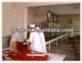 Food microwave drying and sterilizing equipment fits for drying and sterilizing powders , granular , sheet-like or gel-like food, nutritional health products,grain,agricultural&sideline products(rice,cornmeal),bamboo shoot ,tea(wild chrysanthemum flower, broadleaf holly leaf,lotus beaf,green tea,puer tea),ginseng,mushroom,agaric,ganoderma,vegetables and fruits(spinach, carrot, parsley,onion,mango slice,apple slice,lemon slice,kiwi slice,banana slice etc),preserved fruits,red jujube,non-fired(or oil saving)instant noodles,noodles,cookie,biscuit,rice powder noodles,chicken thigh, beef jerky,preserved meat,dried fish,seafood(seaweed,sea cucumber,laver,kelp,sardine,shrimp,abalone,etc), pickles,spice(pepper powder, Chicken essence, beef essence, pork essence, yeast extract, seafood extract, seafood soup fine, seafood soup powder, spareribs soup pure, pure, spareribs soup powder, spices, chili powder,etc),egg yolk powder,jam,a variety of small packaging food, and pet food.